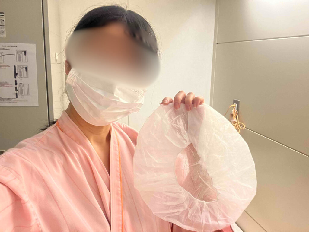 採卵のときと同じく手術着に着替えて、キャップ装着!